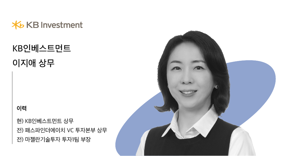 이지애 상무가 몸담고 있는 KB인베스트먼트는 국내 Top tier VC 중 하나로, 전체 운용 규모가 2조원에 달하며 Tips 운용사이기도 합니다. 매년 포트폴리오의 30% 가량은 Early stage에 투자하고 있는 All round VC 입니다. 대표 포트폴리오로는 스푼라디오, 채널코퍼레이션, 크래프트테크놀로지, 눔, 번개장터, 쏘카, 서울로보틱스 등이 있습니다.